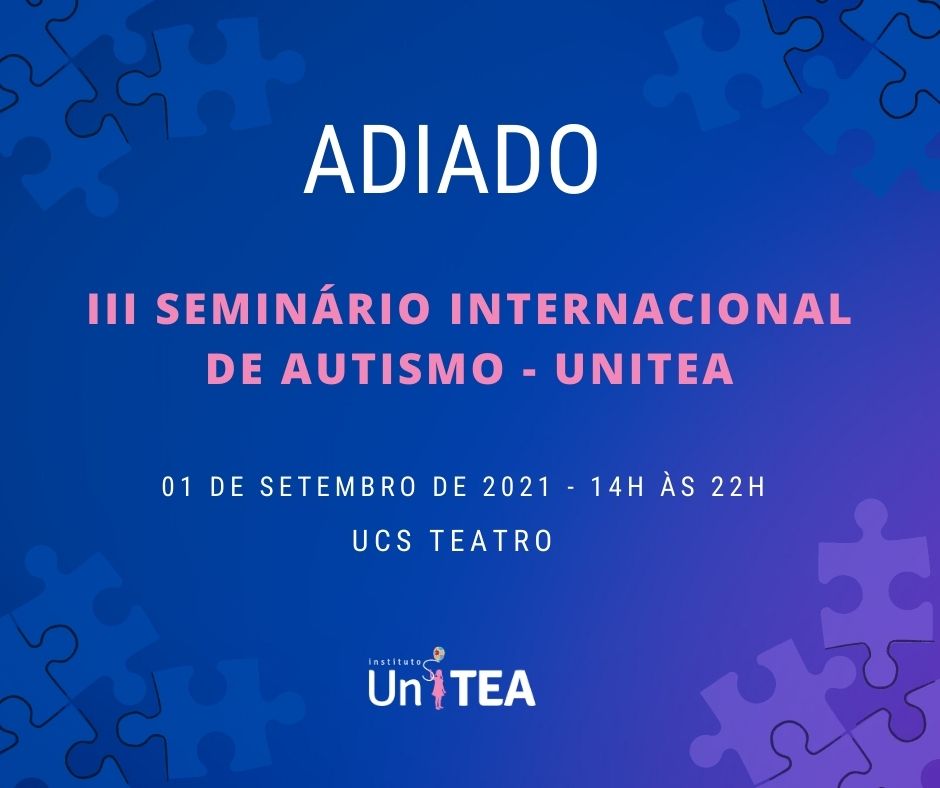 O Instituto UniTEA optou por adiar o III Seminário Internacional de Autismo - UniTEA, que ocorreria no dia 29 de setembro de 2020, no UCS Teatro, em Caxias do Sul, tendo como prioridade o bem estar e a saúde de todos os envolvidos.